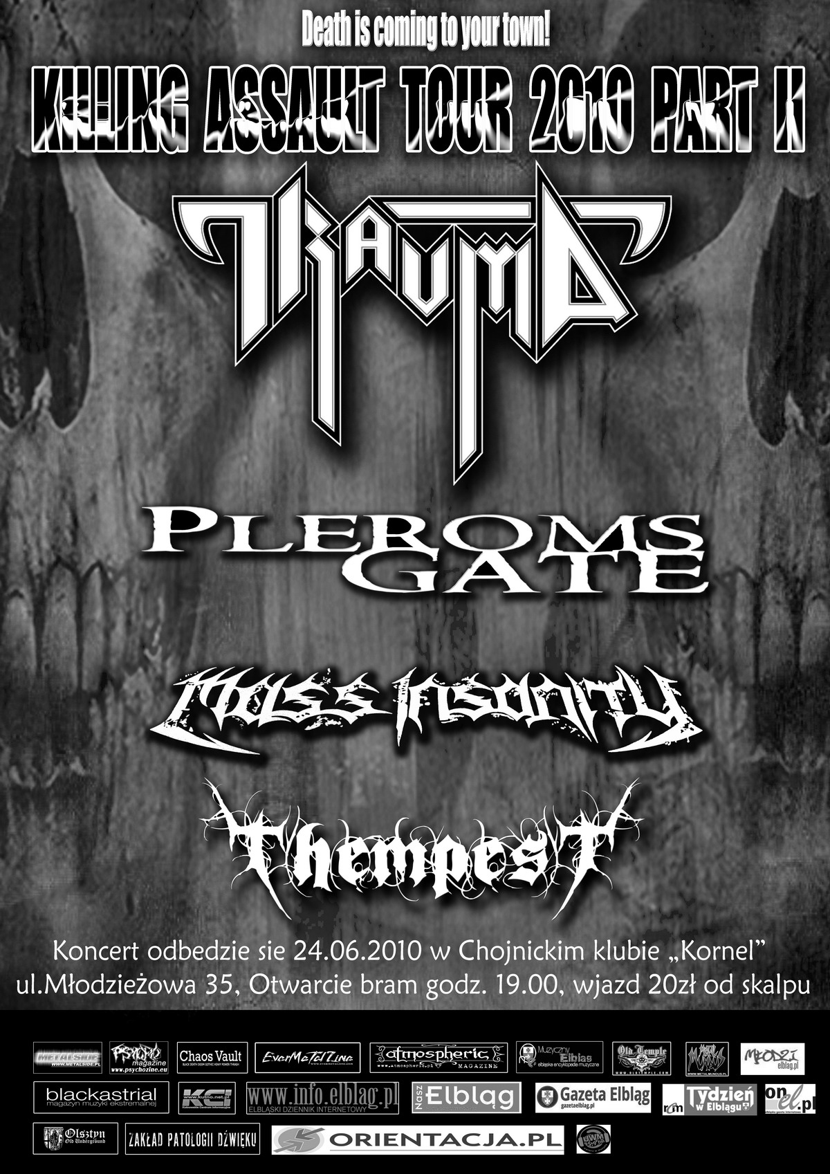 19 czerwca 2010 07:43Muzycy Traumy obiecali, iż po premierze " Archetype Of Chaos" umocnią szyki a słuchacze będą mieli znacznie więcej okazji aby obejrzeć Traumę na żywo. Jak widać dotrzymali słowa. W tym roku kontynuują drugą edycję " Killing Assault Tour". Trasa owa ma na celu promocję mniej znanych wykonawców, którzy zdaniem muzyków przedstawiają bardzo wysoki poziom artystyczno- wykonawczy. " Killing Assault Tour 2010" podobnie jak w ubiegłym roku zawita do pięciu miast: Olsztyn, Chojnice,