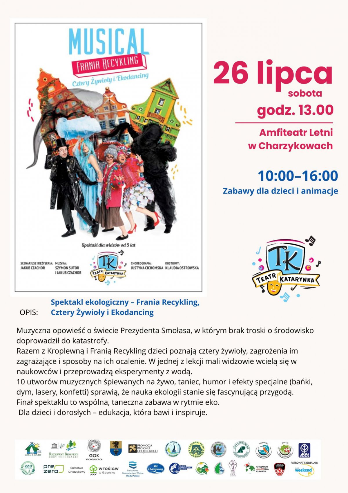 26 lipca o godz. 13:00 serdecznie zapraszamy całe rodziny na spektakl ekologiczny pt.:" Frania Recykling, Cztery Żywioły i Ekodancing", który odbędzie się w Amfiteatrze Letnim w Charzykowach.