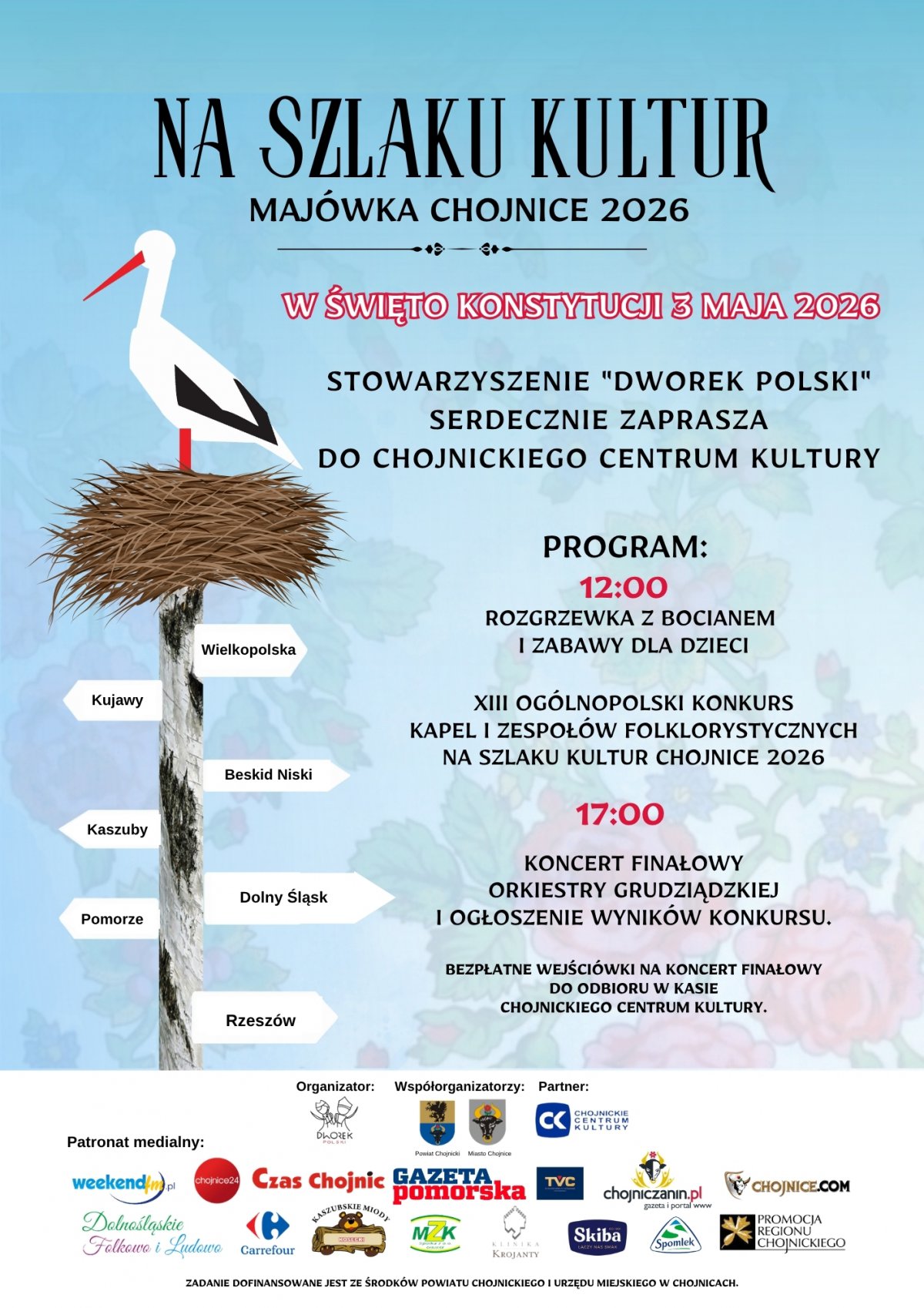 Wspólnie i radośnie świętujmy Święto Konstytucji 3 Maja! Wstęp wolny! Na koncert finałowy obowiązują bezpłatne wejściówki, do odbioru w kasie ChCK. Kontakt: Stowarzyszenie „Dworek Polski” Tel. 791 507 169. Zadanie dofinansowane jest przez Powiat Chojnicki i Gminę Miejską Chojnice. Partnerem zadania jest Chojnickie Centrum Kultury. Organizatorem wydarzenia jest Stowarzyszenie „Dworek Polski”.