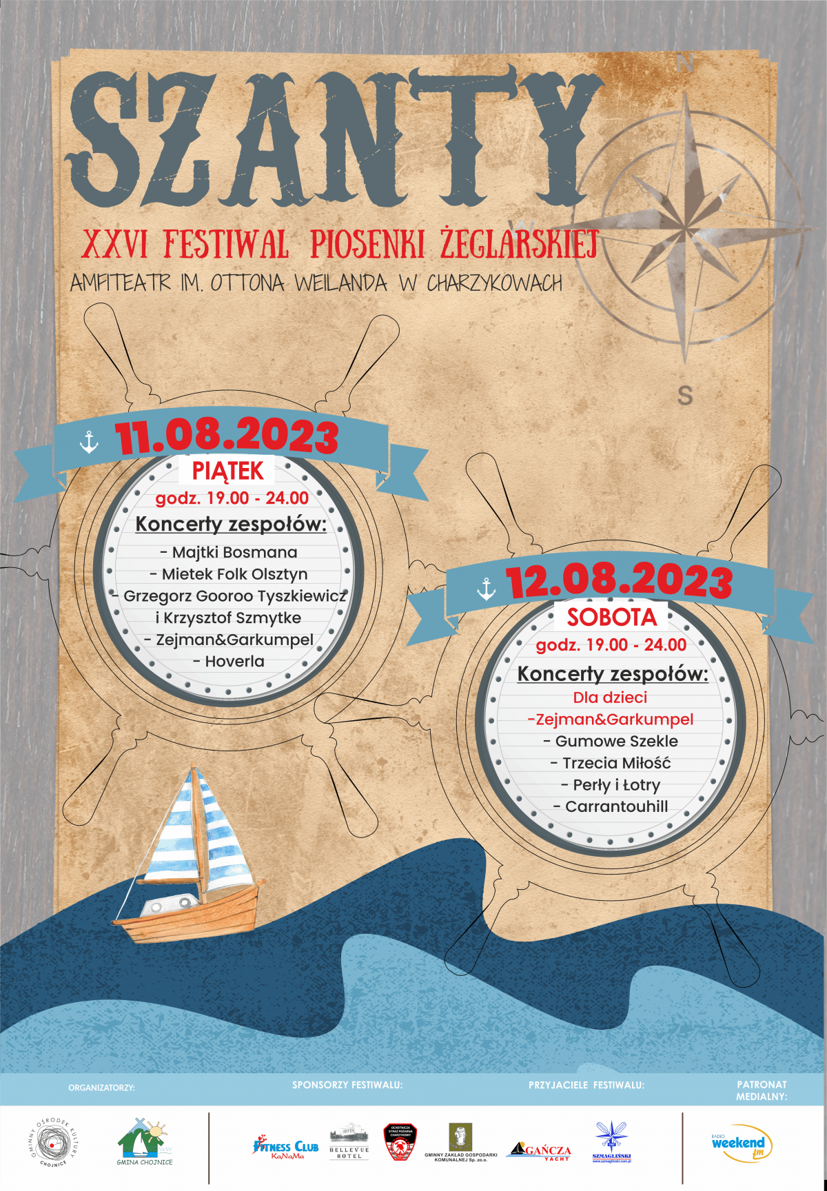 Piątkowy i sobotni (11/12.08.) wieczór w Charzykowach warto zarezerwować sobie na XXVI Festiwal Piosenki Żeglarskiej. Główny organizator, czyli Gminny Ośrodek Kultury w Chojnicach jak zawsze zadba o dobrą muzyczną obsadę, staranną scenografię.