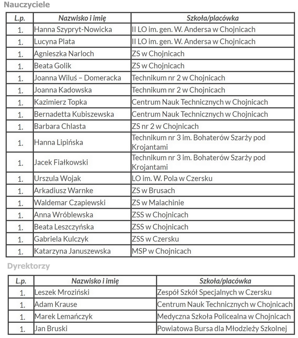 Osiemnastu nauczycieli i czterech dyrektorów placówek oświatowych odebrało wczoraj (13.10.) w Starostwie Powiatowym w Chojnicach nagrody Starosty Chojnickiego Marka Szczepańskiego.