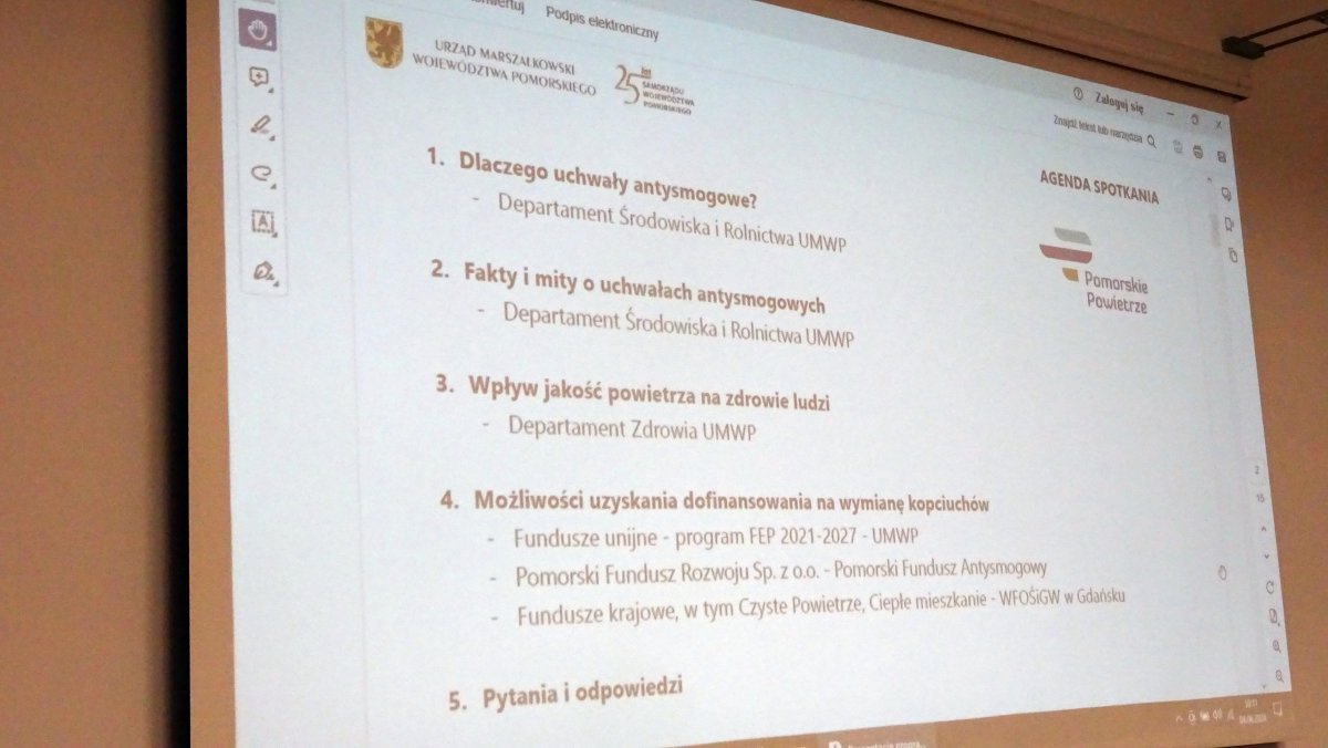 Czy to spotkanie zainteresowało także tzw. zwykłych obywateli, to trudno stwierdzić, gdyż obserwowaliśmy tylko przebieg pierwszej z trzech planowanych godzin jej trwania. W tej części punkt „Pytania i odpowiedzi” jeszcze nie zrealizowano. Planowaliśmy zapytać ws. dyscyplinowania mieszkańców, którzy nie dotrzymają terminów wymiany „kopciuchów” na ekologiczne źródła ciepła, które przyjęto w uchwałach podjętych przez Sejmik Województwa Pomorskiego. Ale zostało to dokładnie opisane na jednej z plansz.