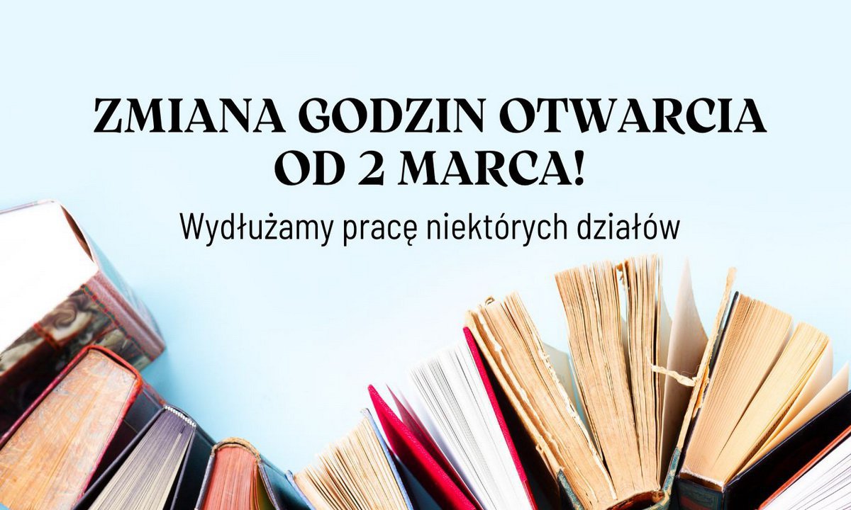 Z myślą o naszych Czytelnikach oraz większej dostępności zbiorów, od 2 marca wydłużamy godziny otwarcia poszczególnych działów Miejskiej Biblioteki Publicznej w Chojnicach.