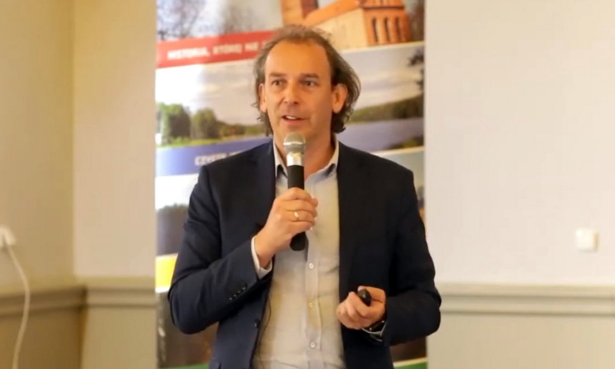 Starosta Marek Szczepański wygłosił referat „Kaszubska Marszruta jako przykład modelowej sieci rowerowych ścieżek przyrodniczych. | fot. screen YT