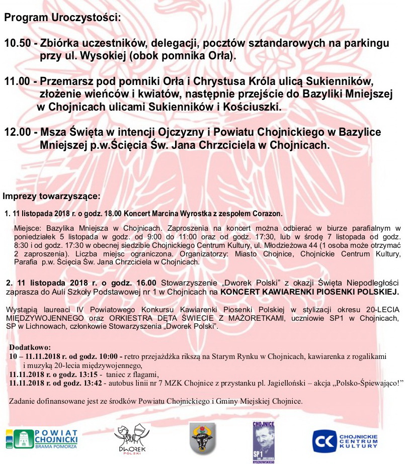 Zapraszamy do wzięcia udziału w powiatowych obchodach Święta Niepodległości w Chojnicach w dniu 11 listopada. Starostwo Powiatowe jest organizatorem oficjalnych obchodów w naszym mieście.