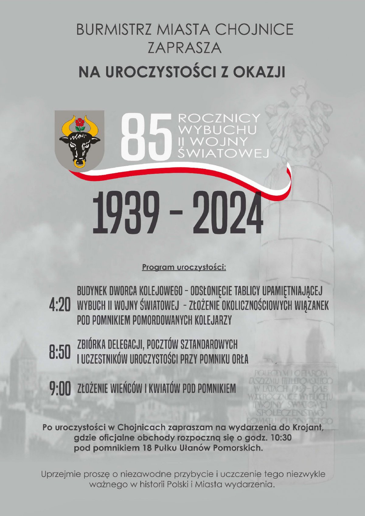 Obchody rozpoczną się 1 września o godz. 4.20 przy Pomniku Pomordowanych Kolejarzy przy ulicy Dworcowej. Pora jest wcześniejsza niż zwykle, by nie kolidowała z uroczystościami gminnymi przy pomniku ułanów w Krojantach.