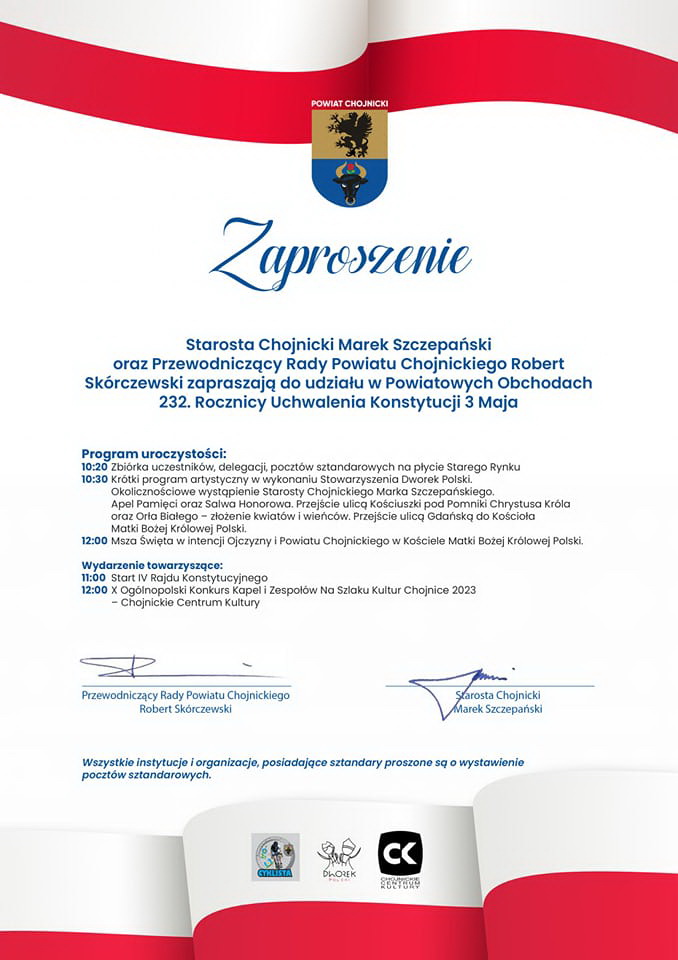 W rocznicę uchwalenia Konstytucji 3 Maja, co roku mieszkańcy naszego miasta będą uczestniczyć w uroczystej mszy świętej odprawianej w intencji ojczyzny, miasta i powiatu w kościele p.w. MBKP i w imprezach towarzyszących.