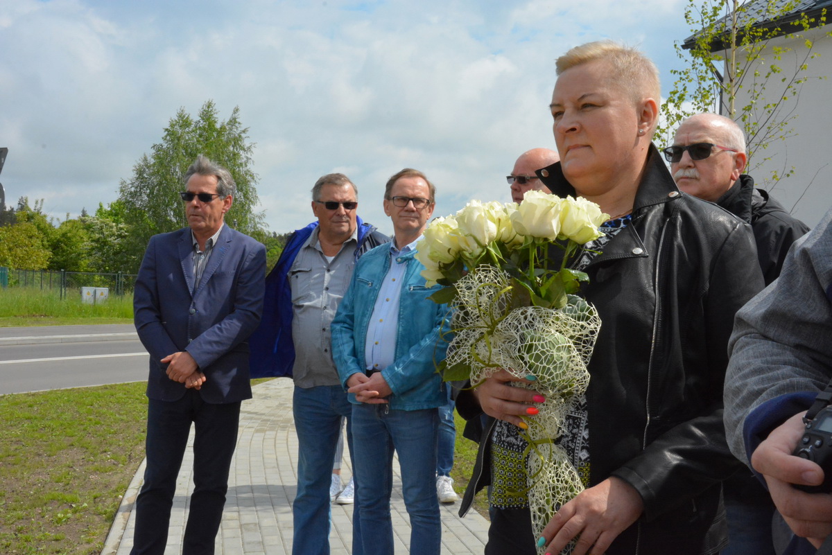 Symboliczną szarfę z tablicy przy rondzie im. Edwarda Gabrysia zdejmowali Danuta Gabryś (żona) oraz burmistrz Arseniusz Finster. | fot. A. Zajkowska
