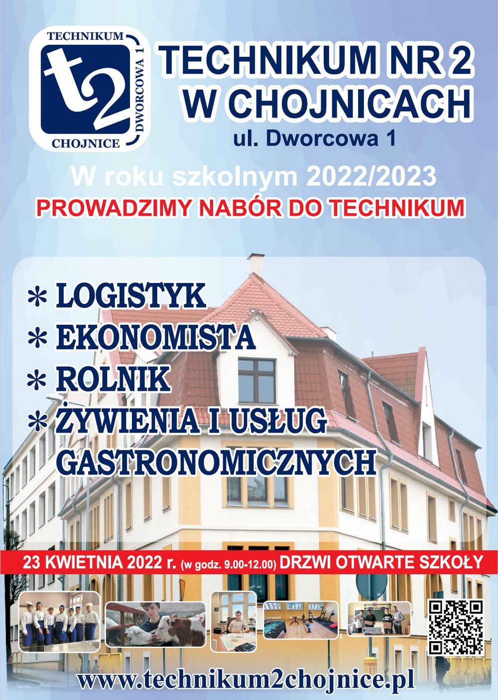 Technikum nr 2 w Chojnicach przy ulicy Dworcowej 1 w sobotę 23 kwietnia w godz. 9.00-12.00 zaprasza na Drzwi Otwarte Szkoły. Dla tegorocznych absolwentów szkół podstawowych przygotowaliśmy bogatą ofertę kształcenia w zawodach.