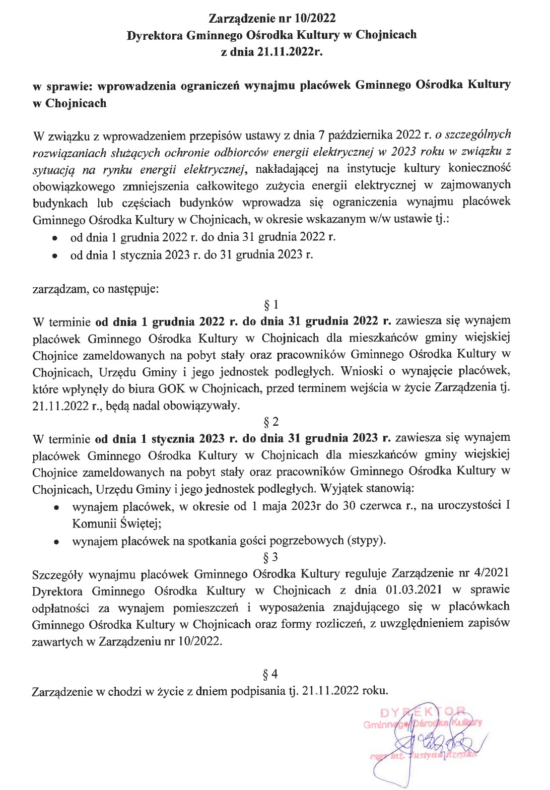 Rozporządzenie w sprawie ograniczeń wynajmu wystosowała Justyna Rząska, dyrektor GOK w Chojnicach. | fot. (je)