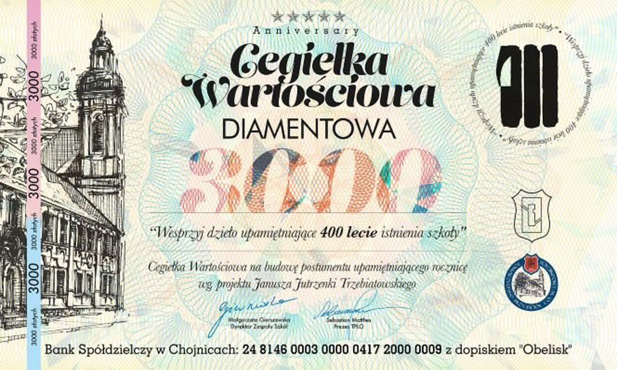 Jednym z ważniejszych wydarzeń związanych z 400-leciem szkoły przy ul. Nowe Miasto w Chojnicach jest ufundowanie postumentu zaprojektowanego przez Janusza Jutrzenkę-Trzebiatowskiego. Stanie on w ogrodach liceum.
