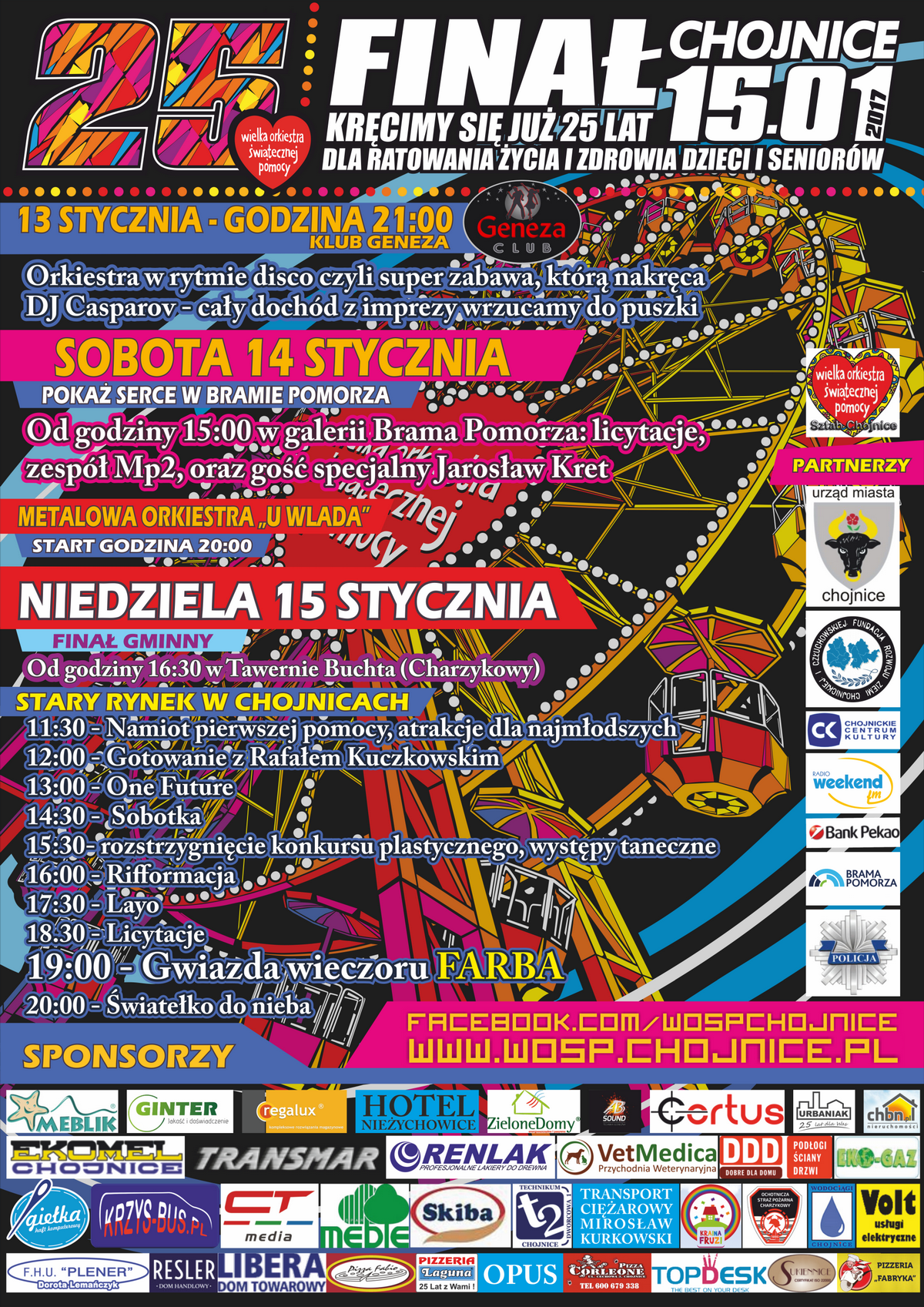 Na rynku m.in. zagościł Rafał Kuczkowski, znany z programu telewizyjnego Hell's Kitchen, panie zatańczyły zumbę z chojnickim studiem Bohema. Od godz. 13.00 na scenie rozpoczęły się koncerty. Wystapiły zespoły: One Future, Farba, Sobotka, Layo i Rifformacja. Finał Wielkiej Orkiestry Świątecznej Pomocy zakończyło o godz. 20.00 Światełko do Nieba.
