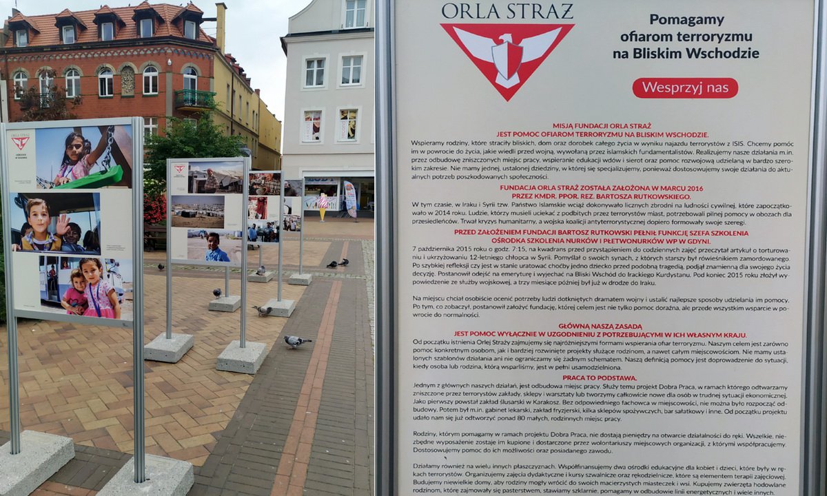 Od 20 sierpnia zapraszamy na chojnicki Stary Rynek na wystawę poświęconą działalności Fundacji Orla Straż. Misją organizacji założonej przez byłych żołnierzy jest pomoc ofiarom terroryzmu na Bliskim Wschodzie.