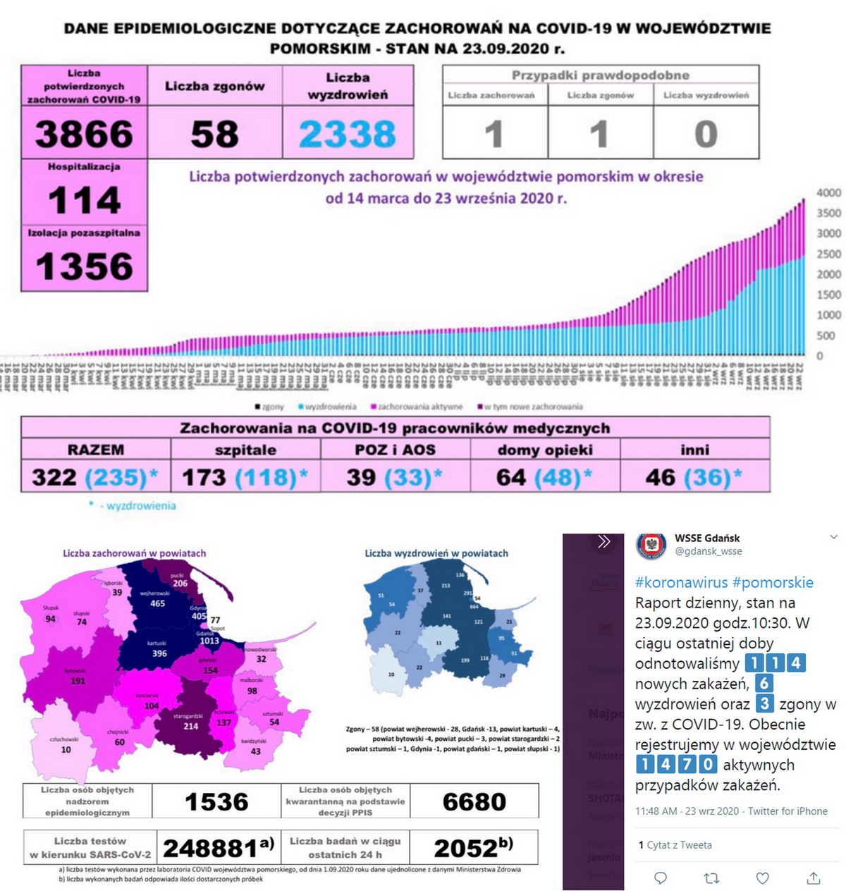 W województwie pomorskim w ciągu ostatniej doby odnotowano 114 nowych zakażeń koronawirusem. Pochodzą one z: miasto Gdańsk (28 osób), miasto Słupsk (10 osób), powiat kartuski (9 osób), miasto Gdynia (8 osób), powiat chojnicki (8 osób), powiat nowodworski (8 osób), powiat gdański (7 osób), powiat wejherowski (6 osób), powiat pucki (5 osób), powiat kwidzyński (4 osoby), powiat kościerski (4 osoby), miasto Sopot (4 osoby), powiat słupski (3 osoby), powiat starogardzki (2 osoby), powiat tczewski (2 osoby).