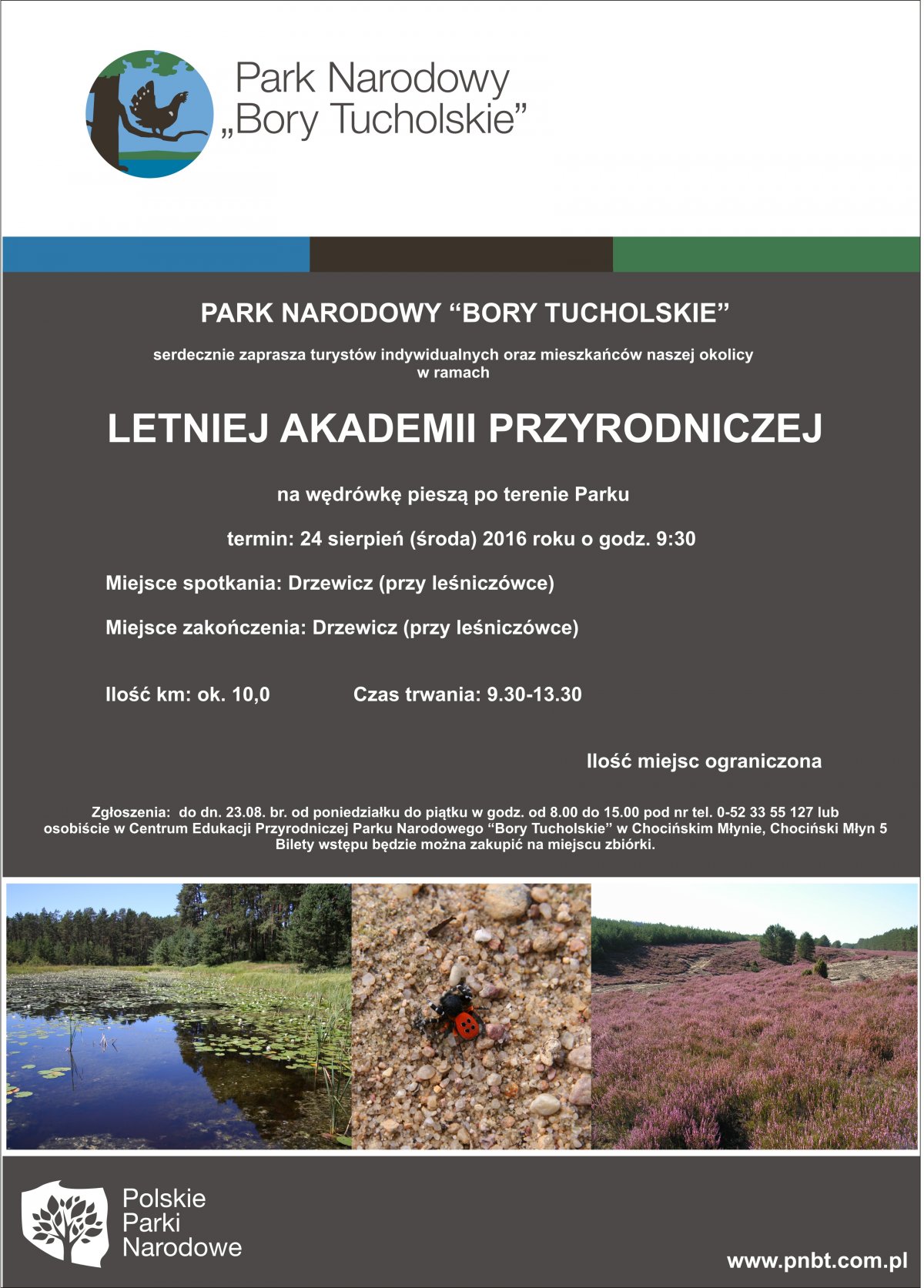 Wszystkich zainteresowanych uczestnictwem w Letniej Akademii Przyrodniczej prosimy o kontakt od poniedziałku do piątku w godz. od 8.00 do 15.00 pod nr tel.(052) 33 55 127 lub osobiście w Centrum Edukacji Przyrodniczej Parku Narodowego „Bory Tucholskie” w Chocińskim Młynie, Chociński Młyn 5 do 23 sierpnia br. Ilość miejsc ograniczona.