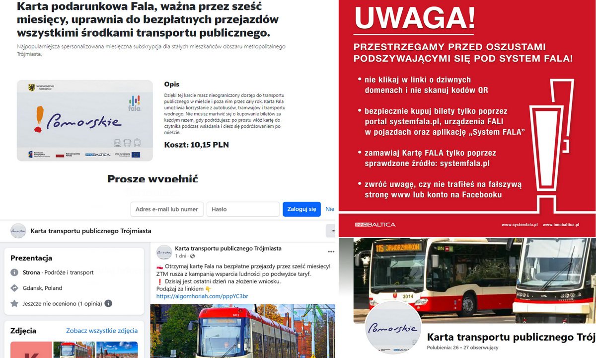 Strona ta wyłudza pieniądze od pasażerów. Jedyną legalną i bezpieczną stroną, przez którą można zamówić Kartę FALA (pierwszy egzemplarz jest bezpłatny), jest https://systemfala.pl/, możliwe też jest wykorzystanie do tego celu aplikacji “System FALA”. Sprawa została już przekazana policji i prokuraturze, spółka InnoBaltica jest w pełnej gotowości do pomocy i współpracy, a fałszywy profil został zgłoszony administracji portalu Facebook (Meta). Wszelkie podejrzane działania prosimy sygnalizować odpowiednim służbom.