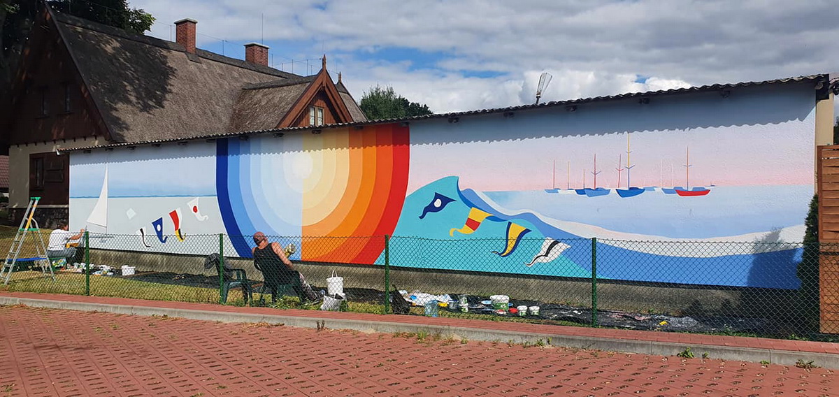 Po prawej stronie - lato - charzykowskie niebo i maszty żaglówek oświetlone zachodem słońca – zachody w Charzykowach i Funce są doprawdy spektakularne, takich nie ma nigdzie indziej! Ważnym elementem muralu są proporczyki Międzynarodowego Kodu Sygnałowego, które skrywają pewną informację. Już podczas malowania podszedł do nas żeglarz i odczytał, co jest napisane na muralu. To było super! - podzieliła się na FB swoimi wrażeniami z malowania murala Anna Eichler.