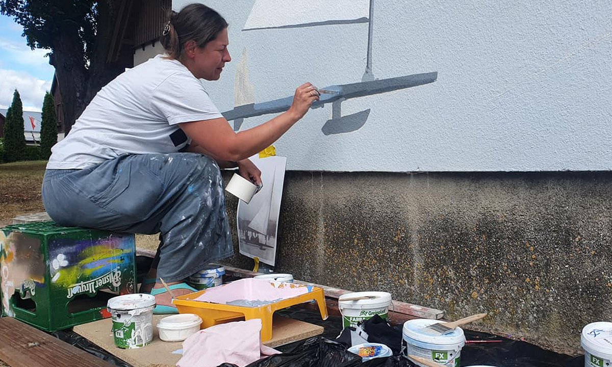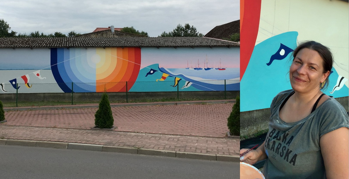 - Długą i wąską ścianę podzieliłam na sekcje spięte zimowo-letnim słońcem. Lewa strona, to zima z jednym z pierwszych modeli bojerów budowanych w dwudziestoleciu międzywojennym w warsztacie szkutniczym Ottona Weilanda i z łyżwiarzem na latawcu na lodzie. (...) Jeśli chodzi o ślizgi lodowe, mieliśmy całe grono ekspertów i entuzjastów, którzy próbowali dociec, jaki model malujemy i pomagali nam rozwikłać zagadki konstrukcyjne, m.in. odpowiedzieć na pytanie, czym jest tajemniczy element pod kadłubem (najprawdopodobniej jest to hamulec). Bardzo dziękujemy!