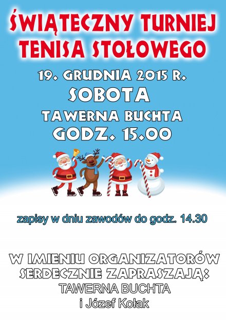 Zapraszamy 19 grudnia o godz. 15:00 wszystkich chętnych do udziału w Świątecznym Turnieju Tenisa Stołowego Zgłoszenia przyjmowane będą w dniu zawodów do godz. 14:30.