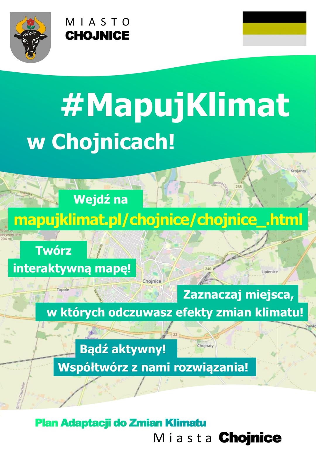 Geoankieta jest dostępna pod adresem https://mapujklimat.pl/chojnice/chojnice_.html. Bardzo zależy nam na zebraniu Państwa opinii, pomogą nam one w formułowaniu zaleceń dotyczących rozwiązywania problemów klimatycznych w Chojnicach.
