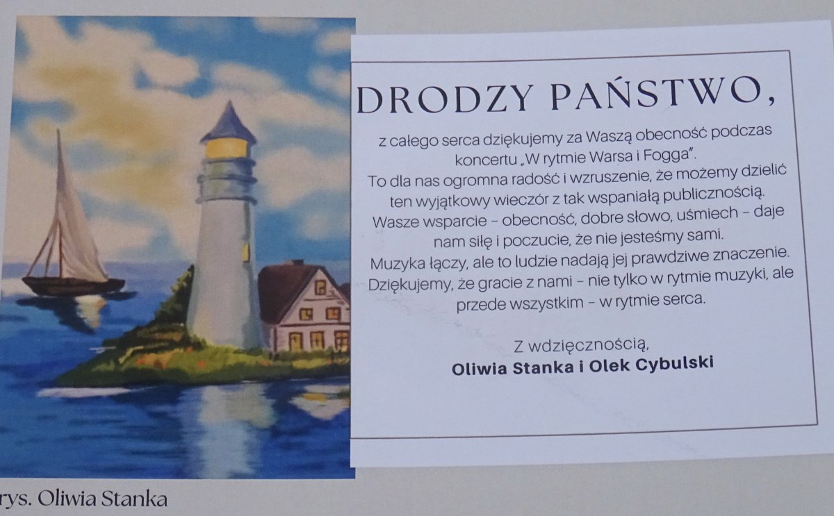 W zamian ofiarodawcy dostawali kartkę z podziękowaniami od beneficjentów: „Dziękujemy, że gracie z nami – nie tylko w rytmie muzyki, ale przede wszystkim – w rytmie serca”. Był też na niej obraz z latarnią morską autorstwa 17-letniej Oliwki, uczestniczki warsztatów malarskich w ChCK.