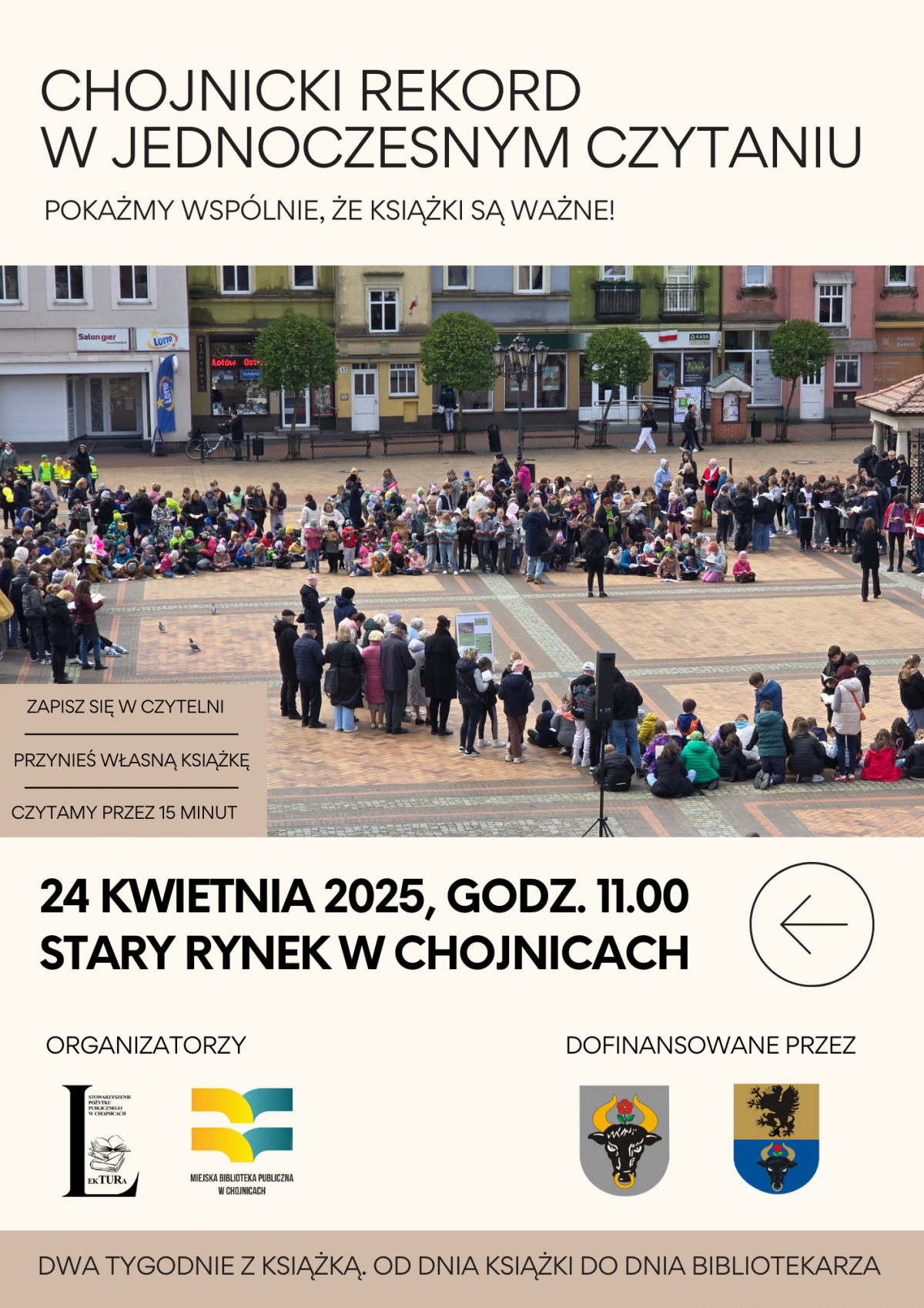 W czwartek 24 kwietnia zapraszamy uczniów, przedszkolaków i wszystkich miłośników książek do Bicia chojnickiego rekordu w jednoczesnym czytaniu pod hasłem: „Pokażmy wspólnie, że książki są ważne!”. Spotkamy się na Starym Rynku przed godz. 11.00. Od godz. 11.00 przez 15 minut będziemy czytać po cichu przyniesione przez siebie książki. Chcemy pobić wcześniejsze rekordy – w 2022 roku czytało 798 osób, w 2023 – 902 osoby, a w roku ubiegłym – 765. Prosimy o zgłaszanie swojego udziału pod numerem tel. 52 397 28 07, wew. 28. Zachęcamy uczestników do przyniesienia własnych książek. Pokażmy wspólnie, że czytamy i że książki są ważne!