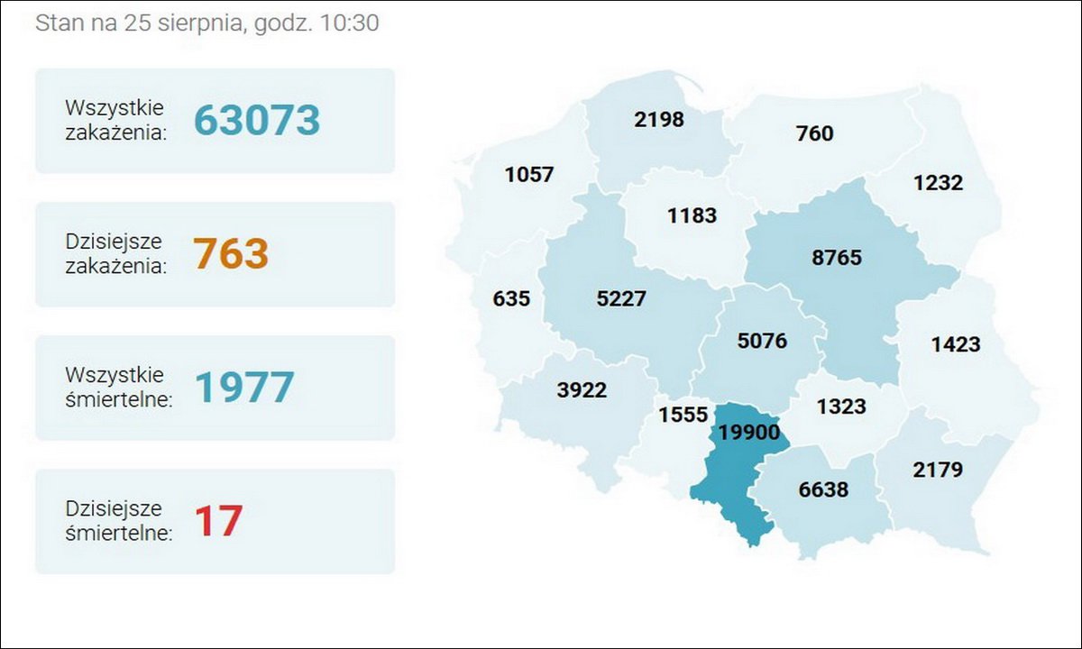 25 sierpnia 2020 14:38Ministerstwo Zdrowia poinformowało o 763 zakażeniach, z czego najwięcej w województwach małopolskim (141), mazowieckim (99) i pomorskim (93). Oznacza to, że Pomorze wyprzedziło Śląsk (89). Zmarło 17 osób, większość z chorobami współistniejącymi.