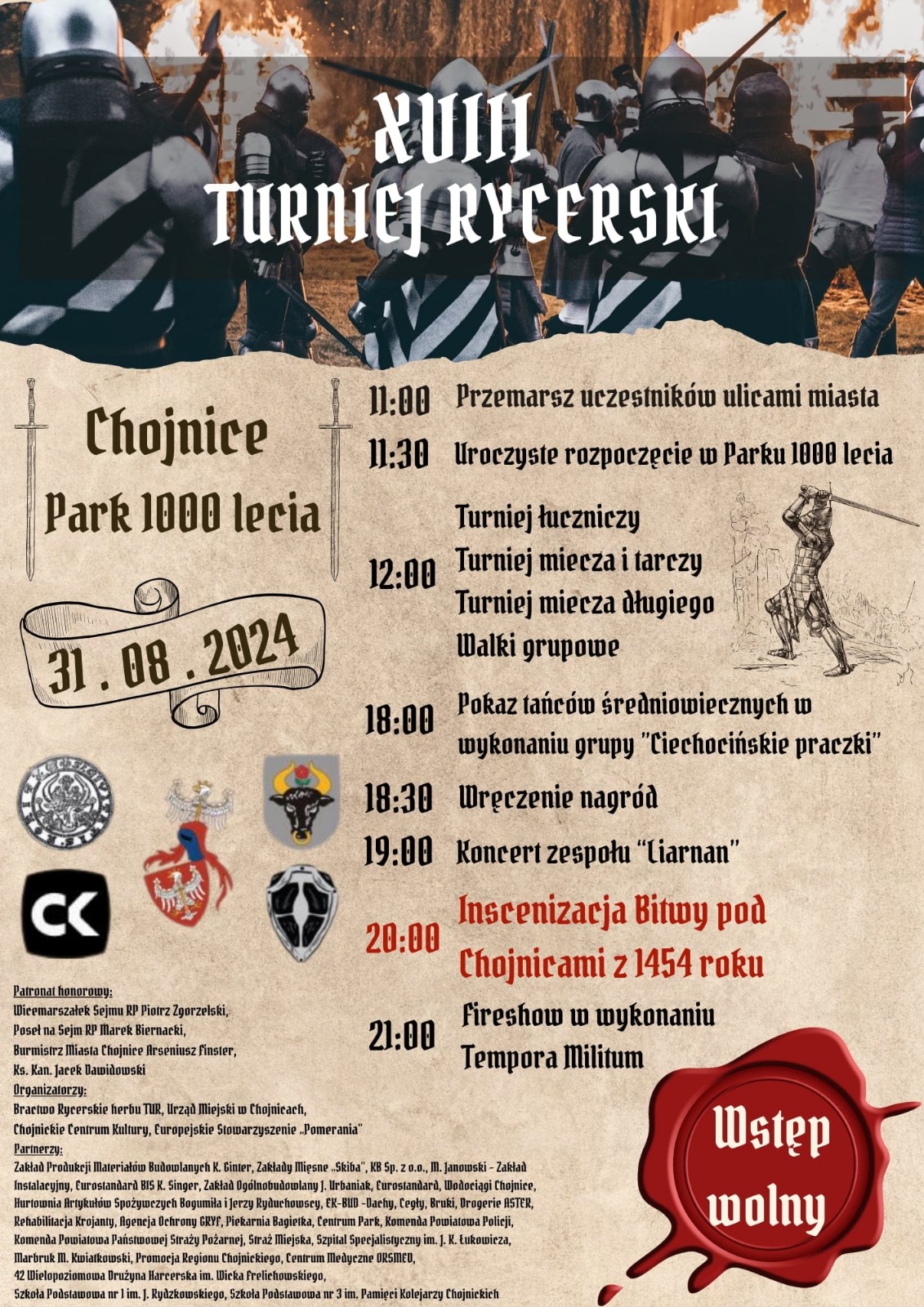 Po raz drugi kolejna edycja Turnieju Rycerskiego będzie nie w Fosie Miejskiej, a w parku 1000-lecia. Jego kulminacja, to inscenizacja bitwy o Chojnice z 18.09.1454. Przegrały ją polskie wojska dowodzone przez króla Kazimierza Jagiellończyka.