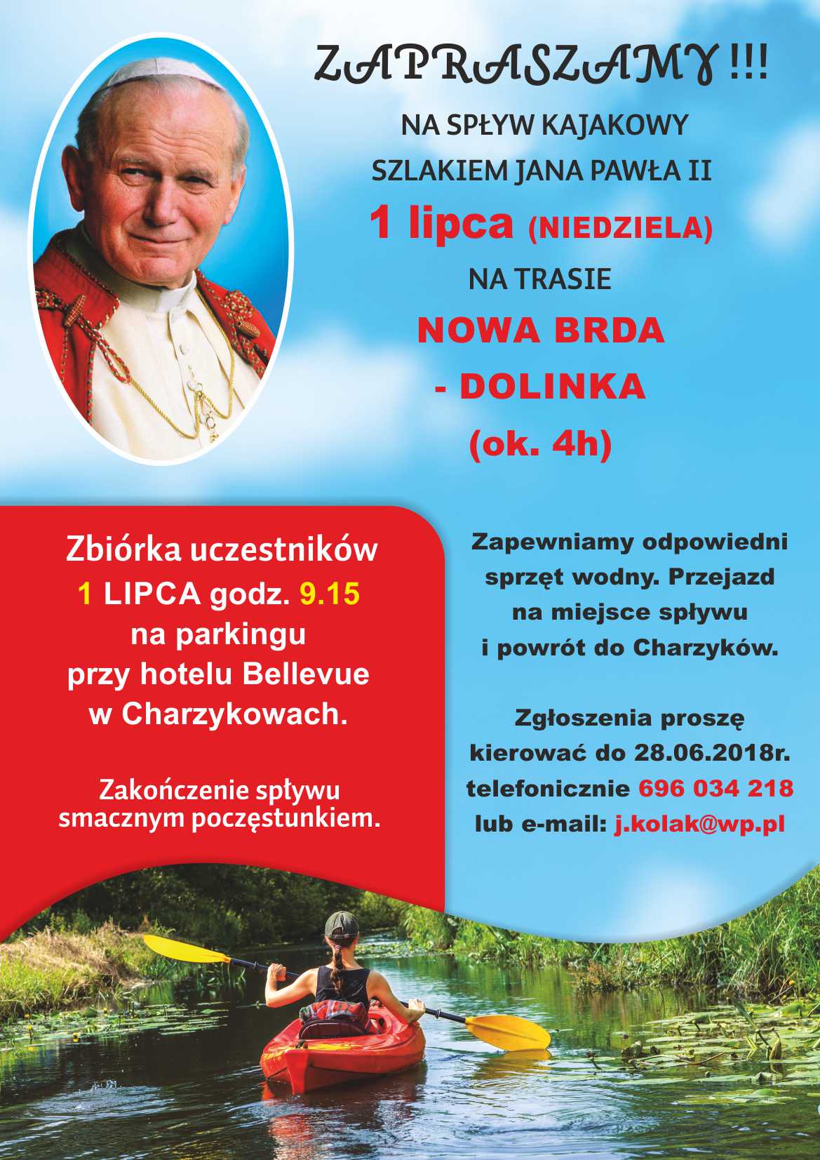 1 lipca (niedziela) odbędzie się kolejna edycja spływu kajakowego „Szlakiem Jana Pawła II” po Brdzie. W regionie mamy tutaj wodny szlak Karola Wojtyły a i on sam jest Honorowym Obywatelem naszego miasta.