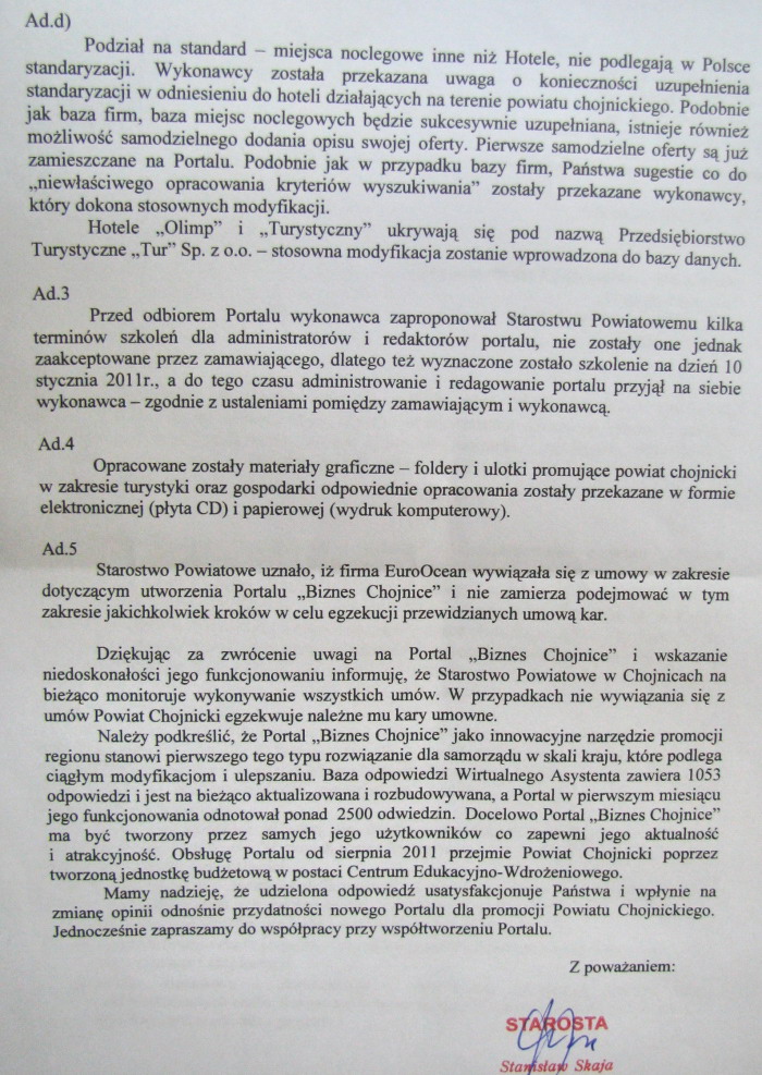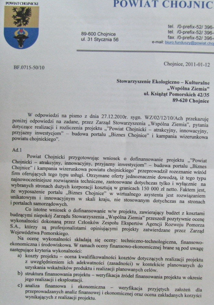 18 stycznia 2011 20:39Otrzymaliśmy od prezesa Radosława Sawickiego odpowiedź Starostwa Powiatowego na pytania Wspólnej Ziemi, która była wysłana tego samego dnia, co pismo stowarzyszenia do prokuratury. Działacze pytali m.in. o powód tak wysokiej ceny za wykonanie portalu; uważali, że przedwczesne było podpisanie protokołu odbioru, gdyż portal miał i ma wiele braków; chcieli dowiedzieć się, czy Starostwo egzekwowało kary umowne. Zobacz treść odpowiedzi (1, 2, 3). Przeprowadziliśmy wywiad z Radosławem Sawickim.