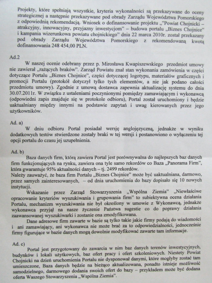 Jak już pisaliśmy, przed kilkoma dniami Stowarzyszenie Wspólna Ziemia skierowało do Prokuratury Okręgowej w Słupsku zawiadomienie o podejrzeniu popełnienia przestępstwa przy realizacji portalu bizneschojnice.eu.