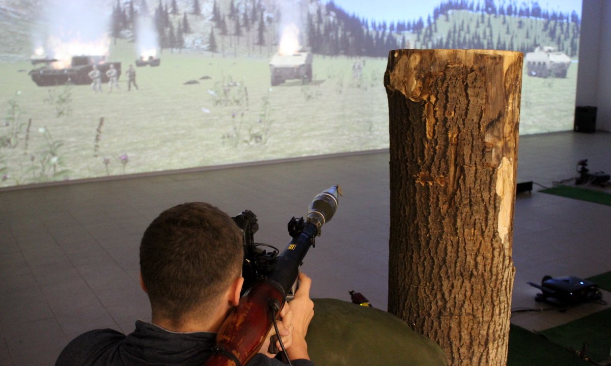 Chętni sprawdzili swoje umiejętności na trenażerze strzeleckim „Śnieżnik”. To jeden z najnowocześniejszych symulatorów w Polsce. Na jego wielkiej planszy wyświetlana jest realistyczna sceneria jakiegoś miejsca, a w niej obiekty, do których się strzela. | fot. J. Kąkol
