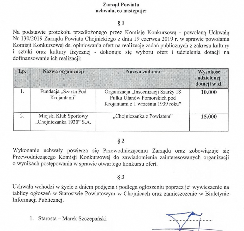 Zarząd powiatu chojnickiego „przyklepał” propozycje komisji konkursowej i przyznał dotacje na realizację zadań publicznych Powiatu Chojnickiego w zakresie kultury fizycznej oraz kultury i sztuki.