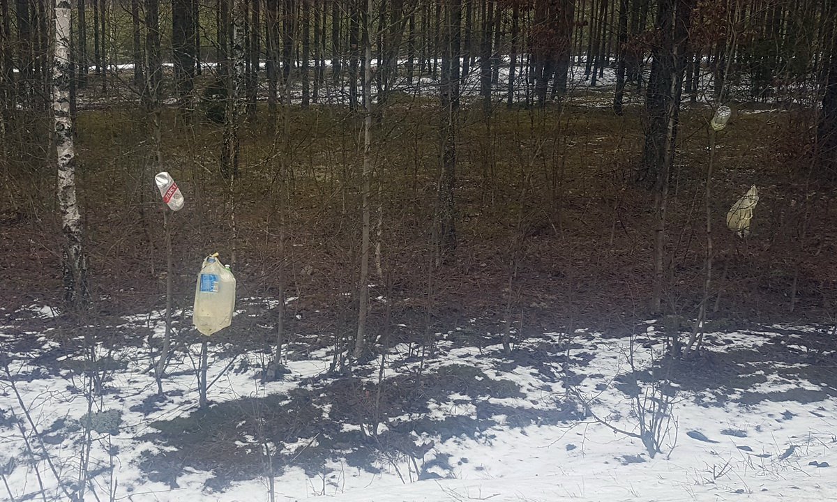 Czytelnik zwraca uwagę na śmieci, załącza również zdjęcia z odcinka drogi między zjazdem na Ostrowite, a Mosną. Na drzewach zostały porozwieszane butelki, puszki, worki foliowe.