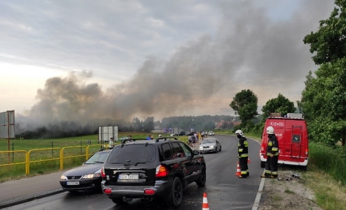 22 czerwca 2021 19:12Mieszkańcy miejscowości Klawkowo mogą mieć problemy z dostępem do wody – informuje straż pożarna. W zdarzeniu nikt nie ucierpiał, ale ze względu na duże zadymienie, w pobliżu miejsca pożaru, są utrudnienia na drodze wojewódzkiej nr 235. Na miejscu znajduje 14 zastępów państwowej i ochotniczej straży pożarnej z powiatu chojnickiego. Dodatkowe zastępy jadą z powiatu człuchowskiego oraz jednostka chemiczna. Ze względu na toksyczny dym strażacy prowadzą akcję gaśniczą w aparatach tlenowych, apelują do mieszkańców o nieotwieranie okien.