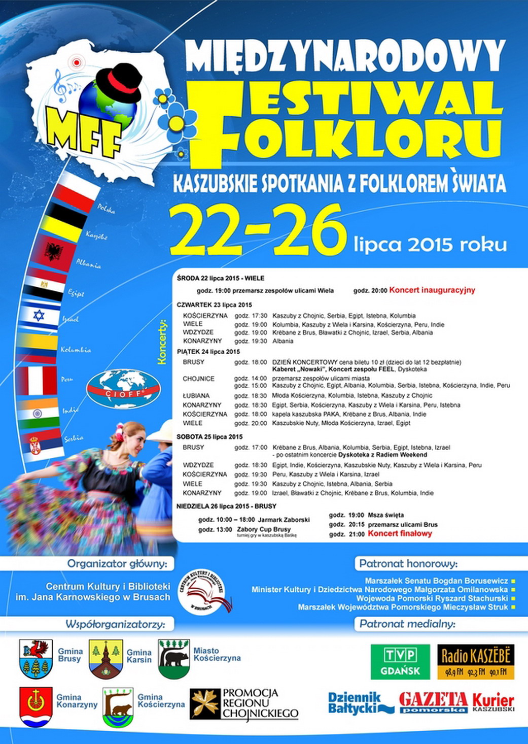 Godz. 15. Koncert w fosie miejskiej: Kaszuby z Chojnic, Egipt Albania, Kolumbia, Serbia, Istebna, Kościerzyna, Indie, Peru;