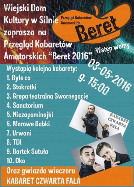 Gorąca atmosfera, świetna zabawa dla początkujących kabareciarzy i występ gwiazdy wieczoru - Kabaretu Czwarta Fala - to wszystko już w dniu 3 maja od godz. 15:00 w sali widowiskowej WDK w Silnie.