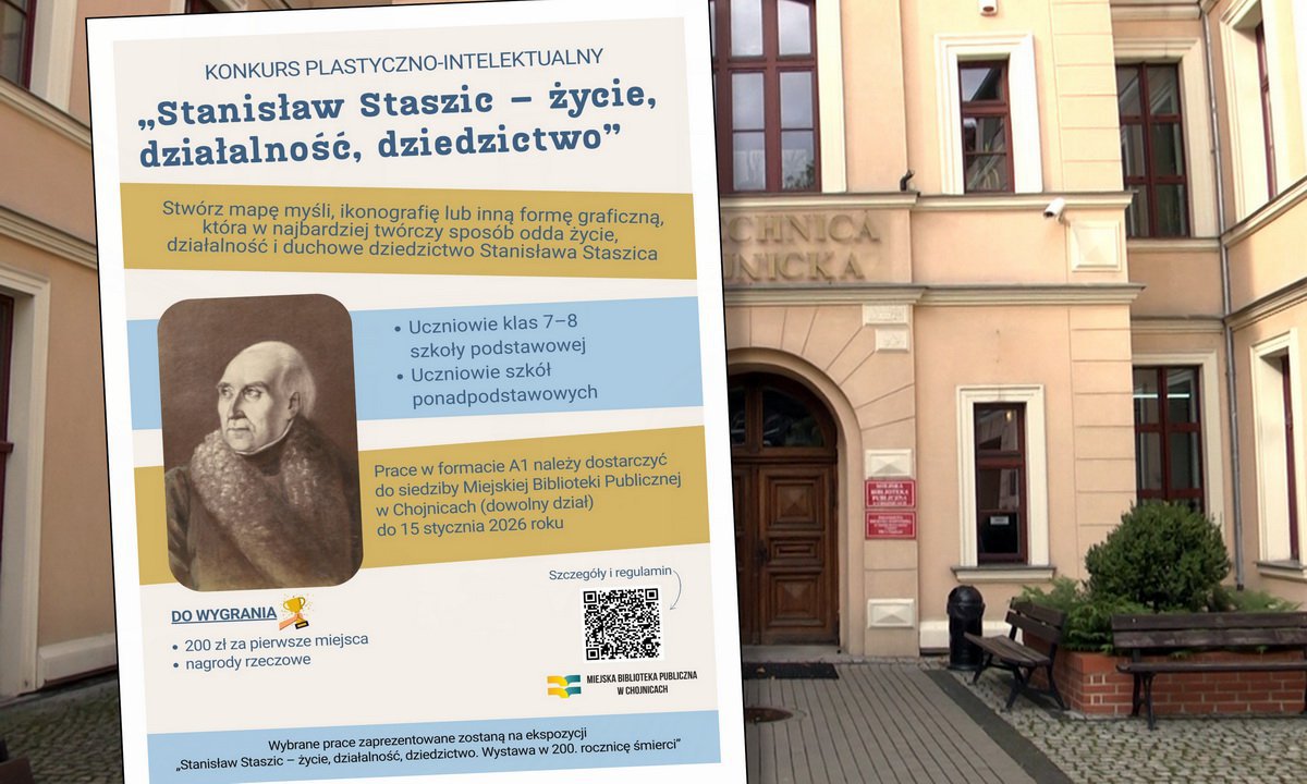 Która w najbardziej twórczy sposób odda życie, działalność i duchowe dziedzictwo Stanisława Staszica. Na konkurs pod hasłem „Stanisław Staszic – życie, działalność, dziedzictwo” należy zgłosić prace oryginalne, inspirujące, ukazujące Staszica jako człowieka czynu, nauki i idei. Prace w formie papierowej, w formacie A1, można składać w siedzibie Miejskiej Biblioteki Publicznej w Chojnicach do dnia 15 stycznia 2026 roku. Konkurs adresowany jest do: uczniów klas 7–8 szkoły podstawowej oraz uczniów szkół ponadpodstawowych. W obu kategoriach wiekowych przewidziano atrakcyjne nagrody, między innymi 200 zł za pierwsze miejsca w obu kategoriach. Szczegóły w regulaminie.