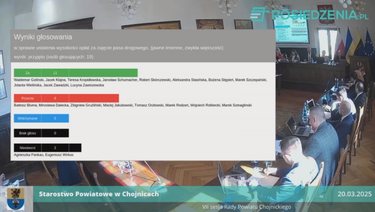 W głosowaniu wniosek Klubu PiS odrzucono 11 głosami, poparło go 7, 1 radny wstrzymał się. Projekt uchwały poparło 11 radnych, przeciw było 8 radnych. Na sesji nieobecni byli Agnieszka Pankau oraz Eugeniusz Wirkus. Więcej w zapisie transmisji sesji od 33.20 minuty na stronie Powiatu Chojnickiego.