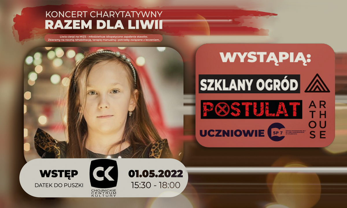 Zapraszamy wszystkich chojniczan - i nie tylko - do udziału w imprezie charytatywnej organizowanej na rzecz jedenastoletniej Liwii chorującej na MIZS. Wydarzenie odbędzie się w niedzielę 1 maja o godzinie 15:30 w Chojnickim Centrum Kultury.