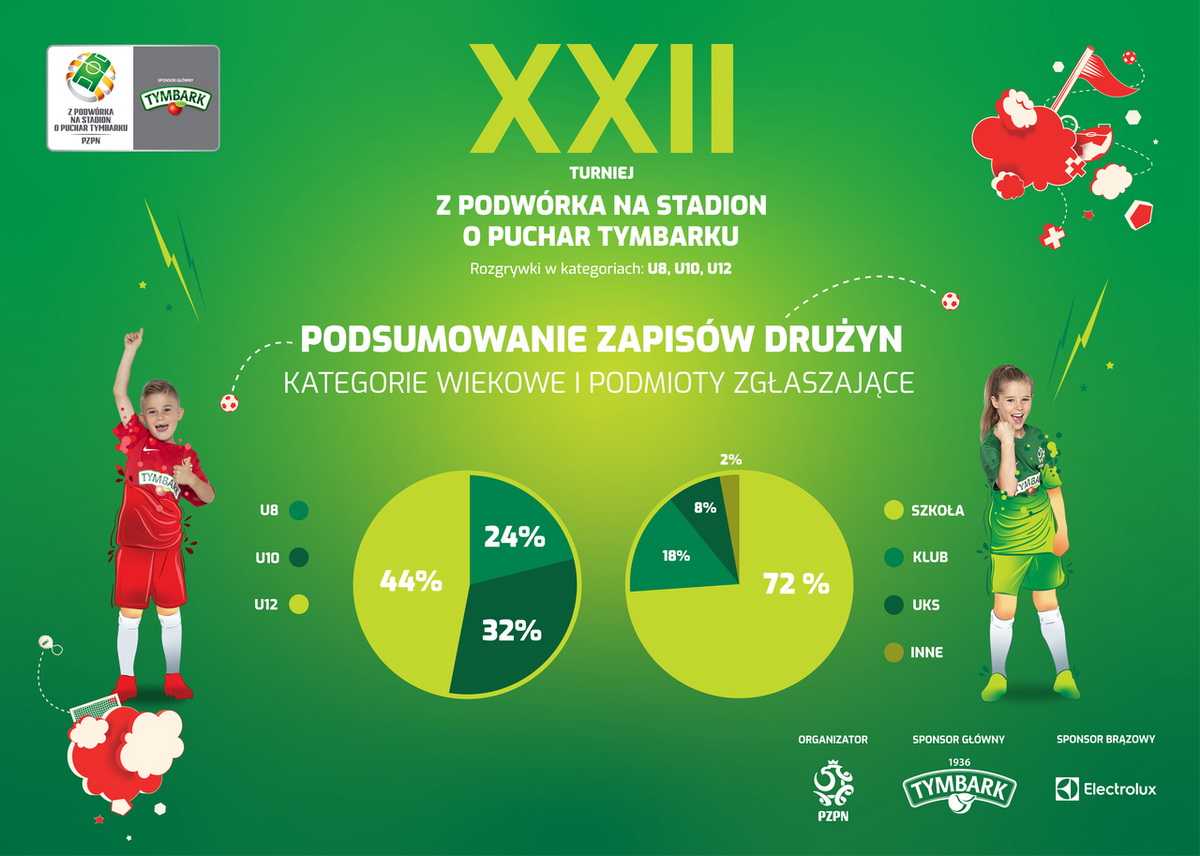 W tym roku przed taką szansą staną kolejne dzieci. W tegorocznych rozgrywkach najliczniej reprezentowana będzie najstarsza kategoria wiekowa – U-12. Zespoły zgłoszone do Turnieju stanowią aż 44 proc. wszystkich drużyn. Ekipy do lat 10 stanowią 32 proc. frekwencji, a najmłodszą kategorię wiekową U-8 reprezentuje 24 proc. zespołów. Do tegorocznej edycji najwięcej drużyn zgłosiło się z województw: Wielkopolskiego, Małopolskiego i Lubelskiego. Niemal każdy powiat (98 proc.) będzie w tym roku reprezentowany przez co najmniej jedną drużynę.