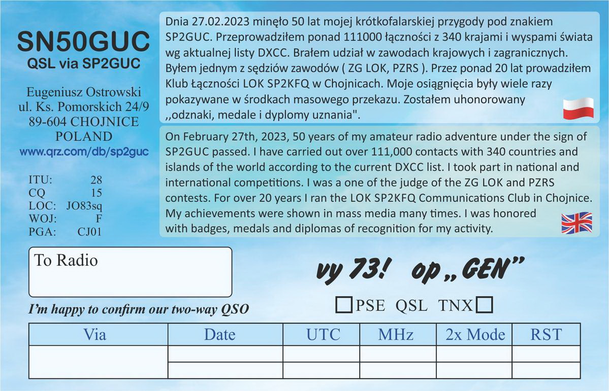 W dniach 27 luty 2023 - 26 luty 2024 r. z okazji 50 lecia znaku SP2GUC pracować będzię okolicznościowa, jubileuszowa stacja SN50GUC Eugeniusza Ostrowskiego z Chojnic.