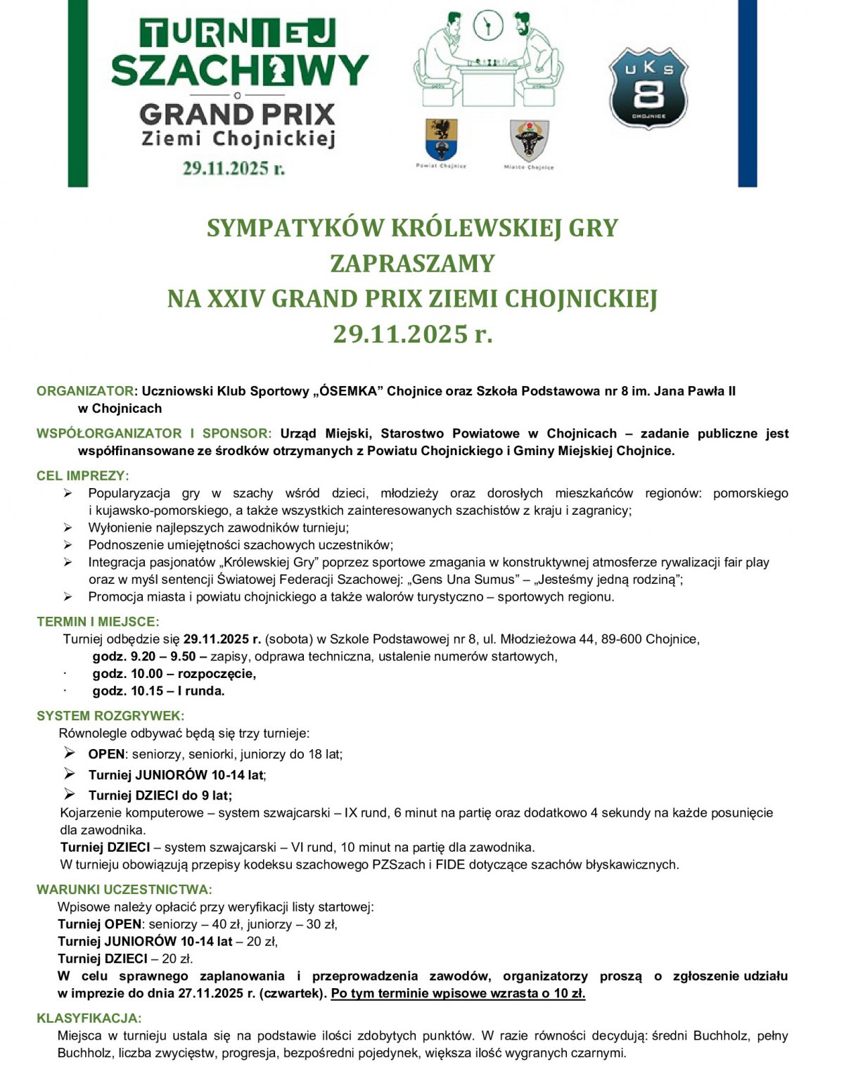 W Szkole Podstawowej nr 8 w Chojnicach w sobotę 29listopda odbędzie się XXIV Turniej Szachowy o Grand Prix Ziemi Chojnickiej, a do udziału w turnieju zapraszają organizatorzy.