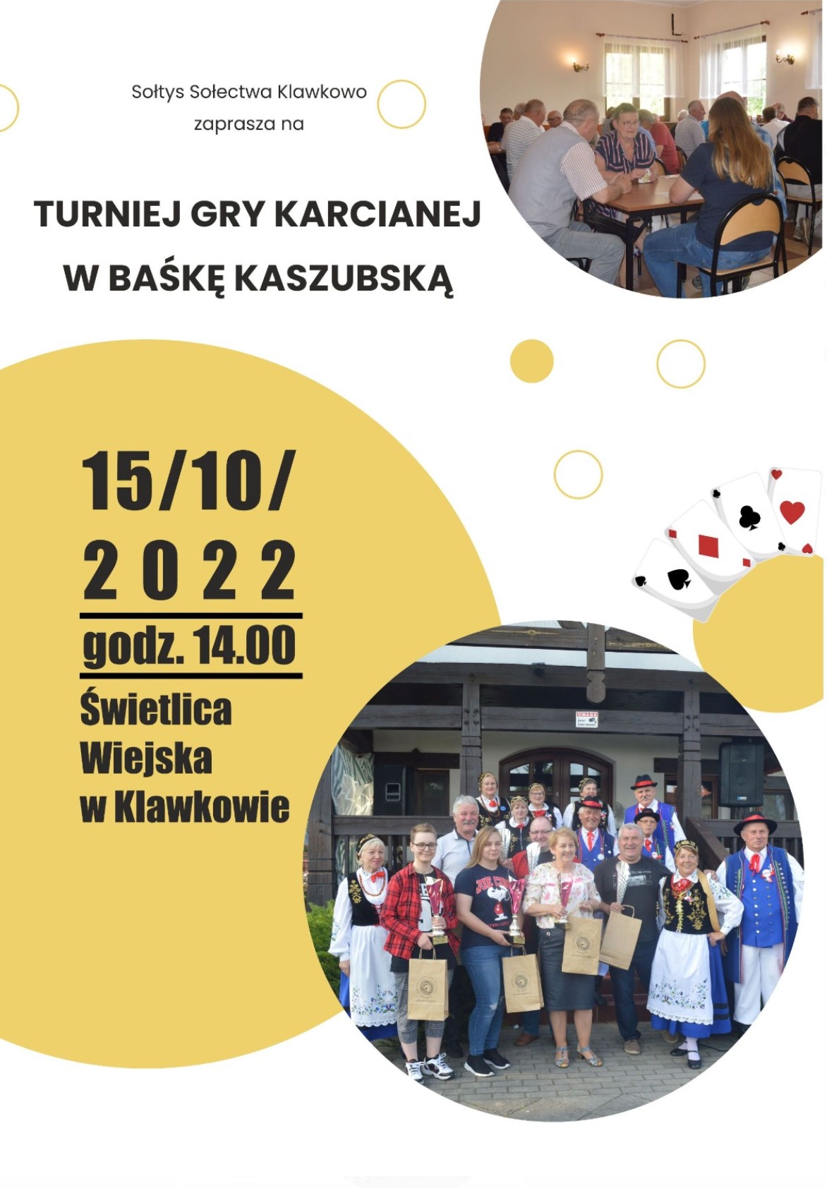 Sołtys Klawkowa Ludwika Pokojska zaprasza w sobotę 15.10 na Turniej Gry Karcianej w Baśkę Kaszubską. Zawody rozpoczną się o godzinie 14.00 w Wiejskiej Świetlicy w Klawkowie.