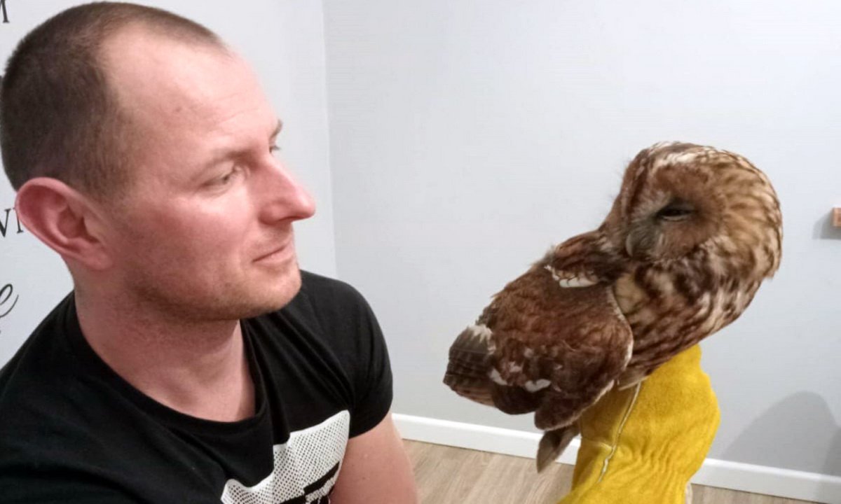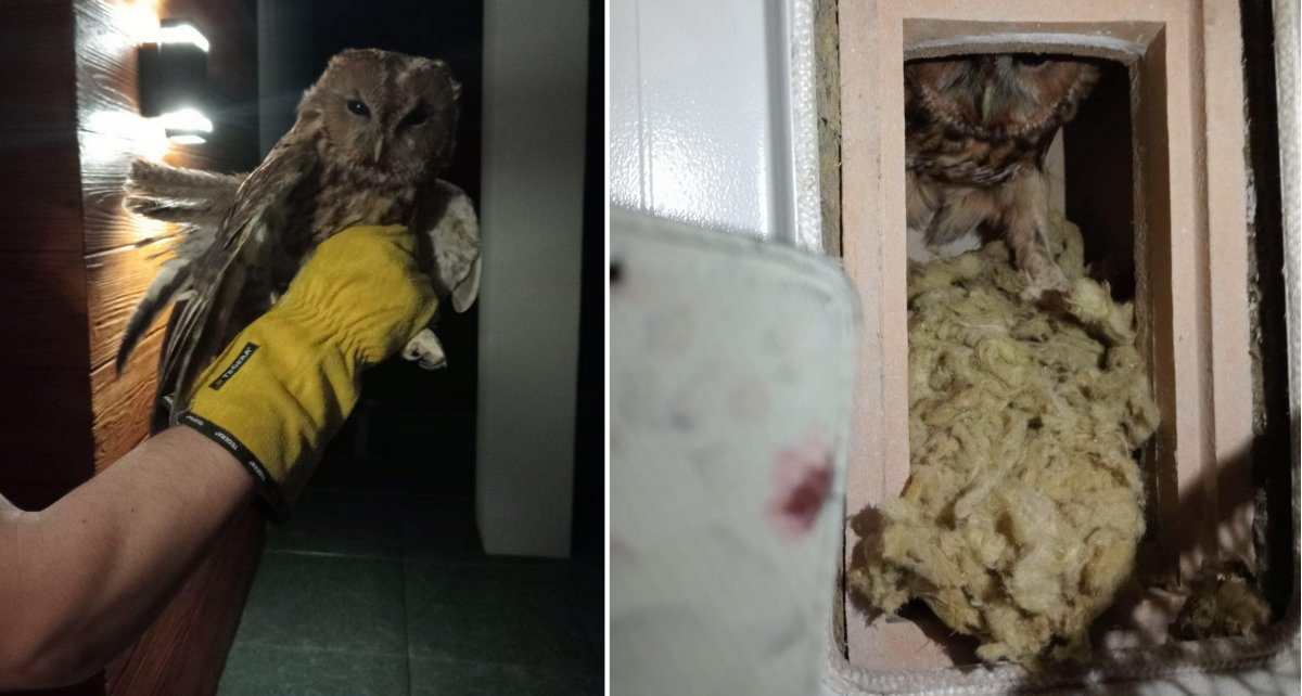 Żona Pana Damiana usłyszała dziwne odgłosy ze ściany, w której znajdują się nie używane przewody kominowe. Ptaka udało się uratować z opresji dzięki drzwiczkom rewizyjnym. Przydały się w tym m.in. specjalne rękawice. Po wyciągnięciu okazało się, że w przewodzie utknęła piękna... sowa.