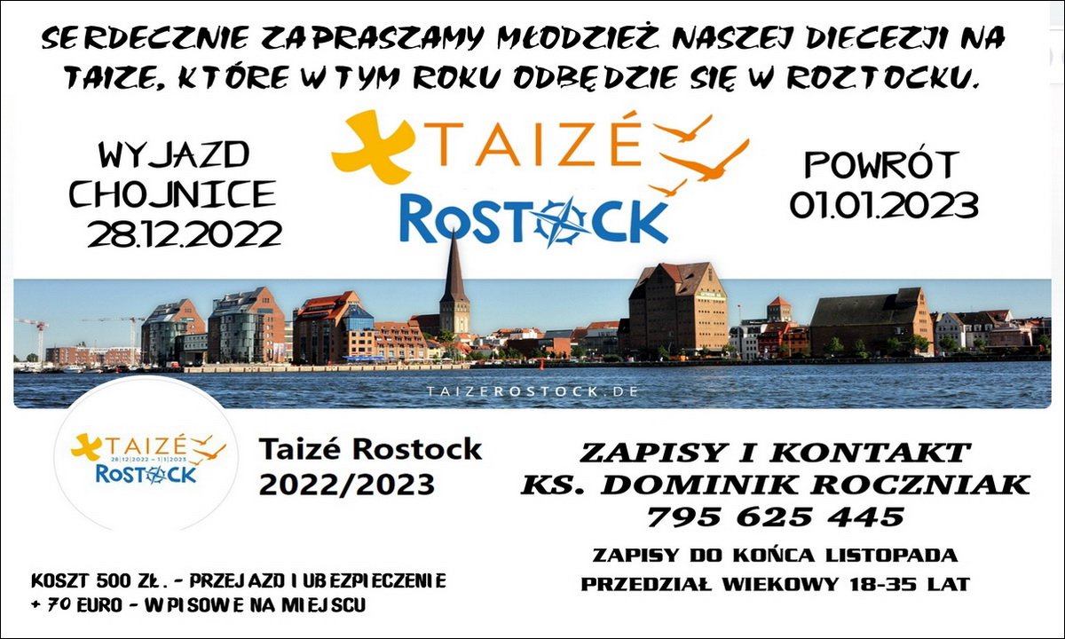 Koszt przejazdu z ubezpieczeniem wynosi 500 zł + 70 Euro. Zapisy do końca listopada chętnych z Chojnic i okolic u ks. Dominika Roczniaka z parafii pw. Ścięcia św. Jana Chrzciciela w Chojnicach pod numerem telefonu 795-625-445. Program i informacje praktyczne są na https://www.taize.fr/pl_article4986.html