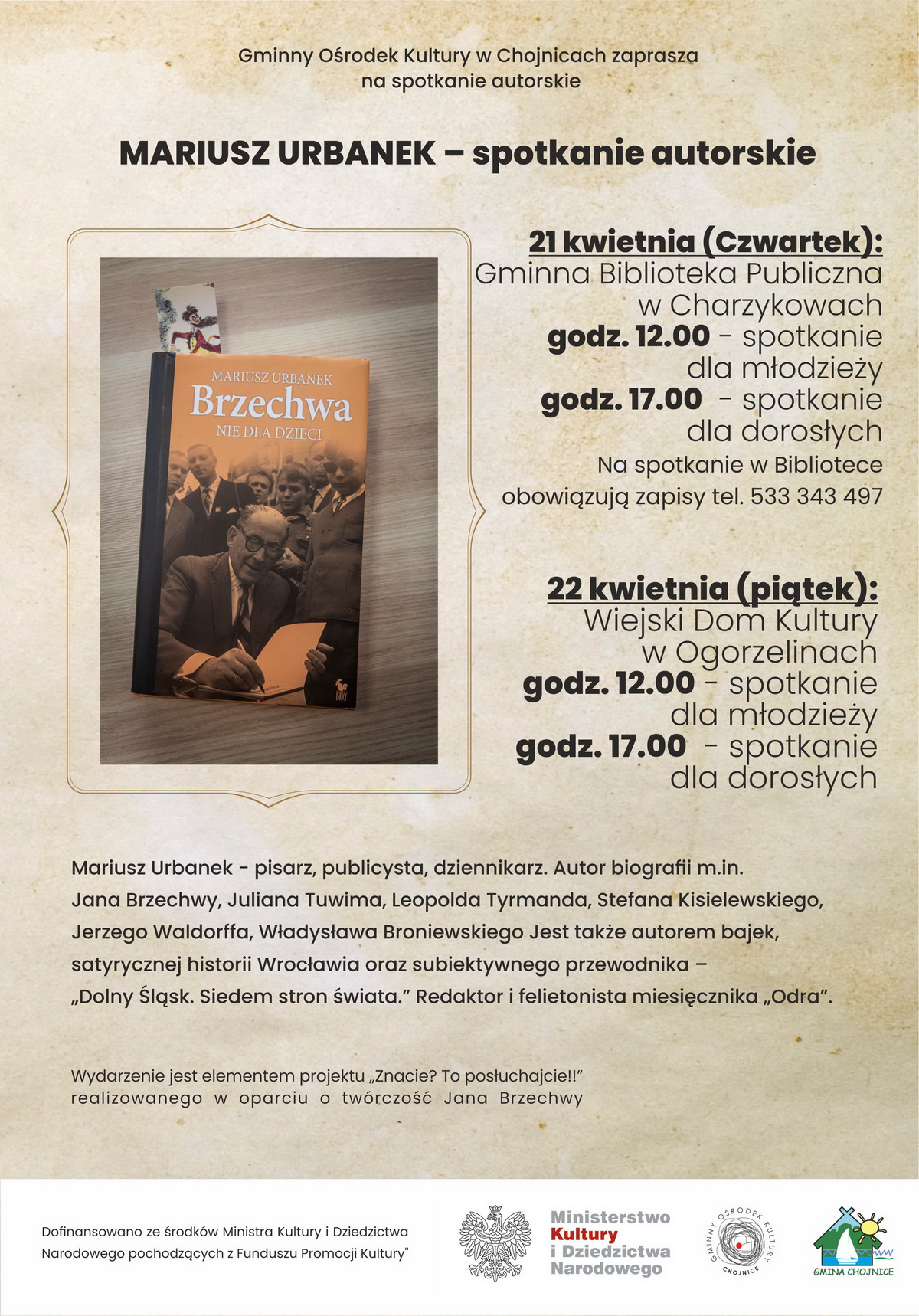 I właśnie autorstwo tej ostatniej publikacji: „Brzechwa nie dla dzieci” jest powodem, dla którego pisarz zagości w placówkach GOK. Wydarzenie jest elementem projektu „Znacie? To posłuchajcie!!” realizowanego w oparciu o twórczość Jana Brzechwy. Spotkanie z autorem biografii Jana Brzechwy rozpoczyna cykl działań popularyzujących twórczość autora „Akademii Pana Kleksa” i wielu innych utworów.