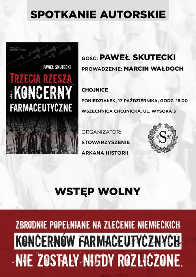 W poniedziałek 17 października o godz. 18 we Wszechnicy Chojnickiej odbędzie się spotkanie z Pawłem Skuteckim, autorem książki "Trzecia Rzesza i koncerny farmaceutyczne".