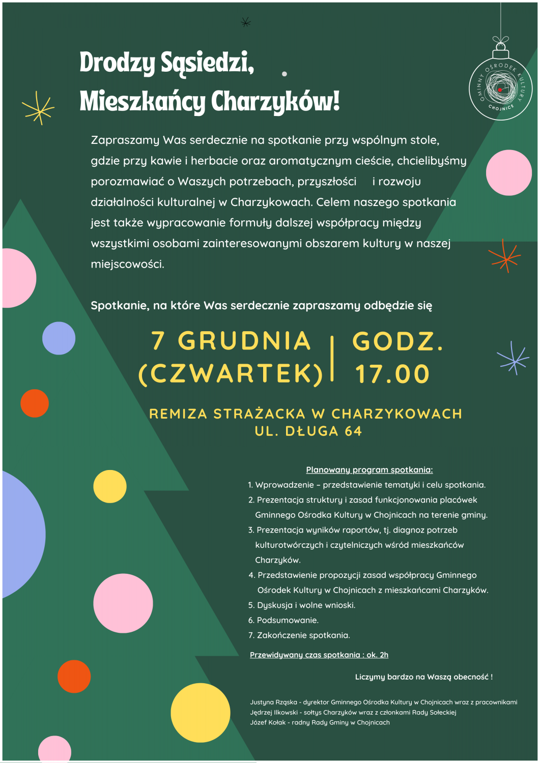 Spotkanie odbędzie się w budynku Ochotniczej Straży Pożarnej 7 grudnia o godz. 17. Tematem zebrania będą m.in. sprawy kulturalne w kontekście współpracy Gminnego Ośrodka Kultury z mieszkańcami miejscowości.