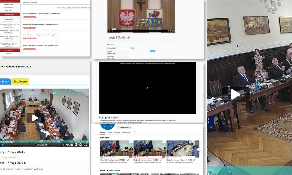 Screeny z zapisów transmisji obrad RG Chojnice, RG Konarzyny, RM Brusy, RM Czersk oraz RP Chojnickiego. Czarna plama w środku, to niedostępny zapis sesji RM Chojnic z 7.05.br. | fot. screen